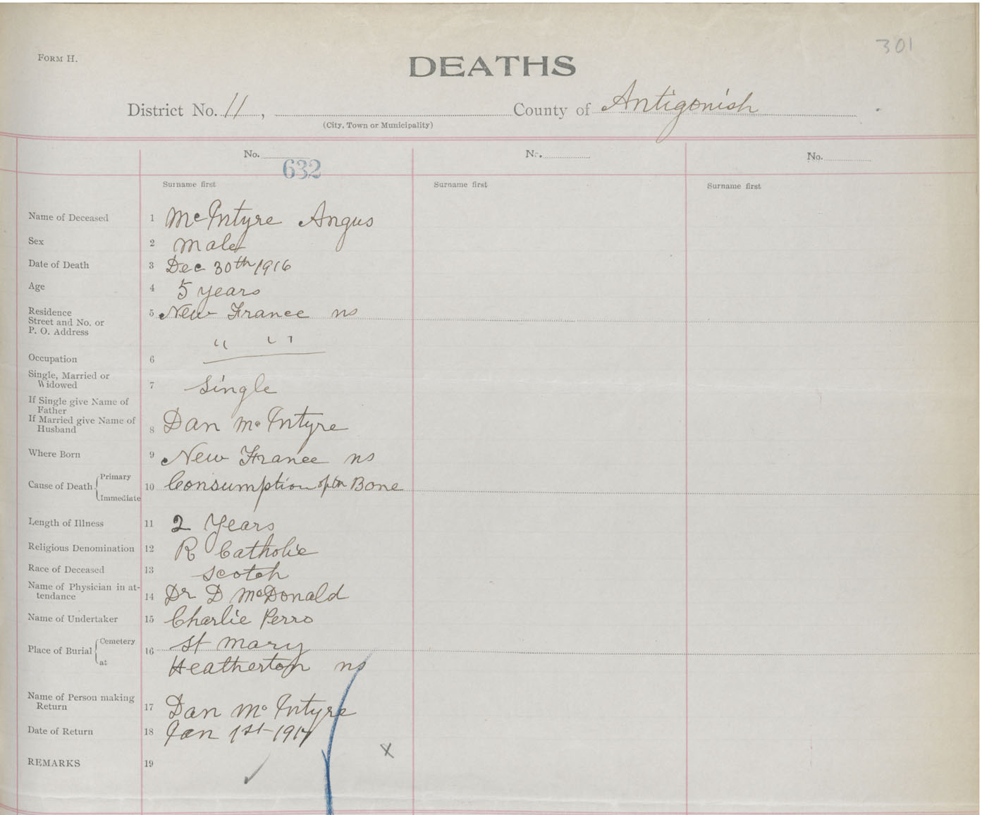 Male Death Registration: Year: 1916 book: 26 page: 301 number: 632