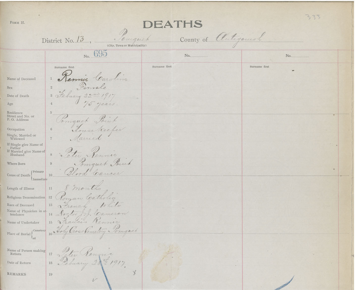 Female Death Registration: Year: 1917 book: 26 page: 333 number: 695