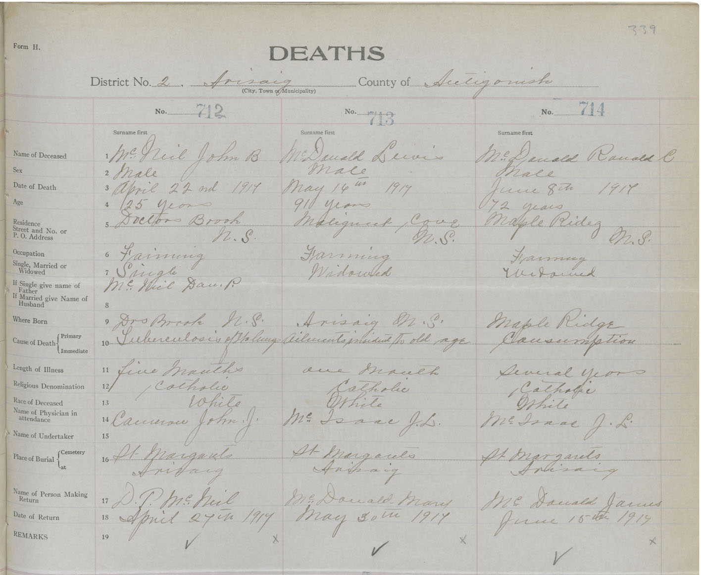 Male Death Registration: Year: 1917 book: 26 page: 339 number: 714