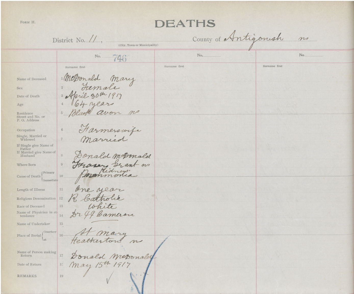 Female Death Registration: Year: 1917 book: 26 page: 358 number: 746