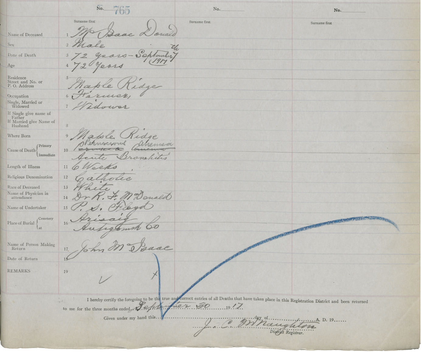 Male Death Registration: Year: 1917 book: 26 page: 365 number: 765