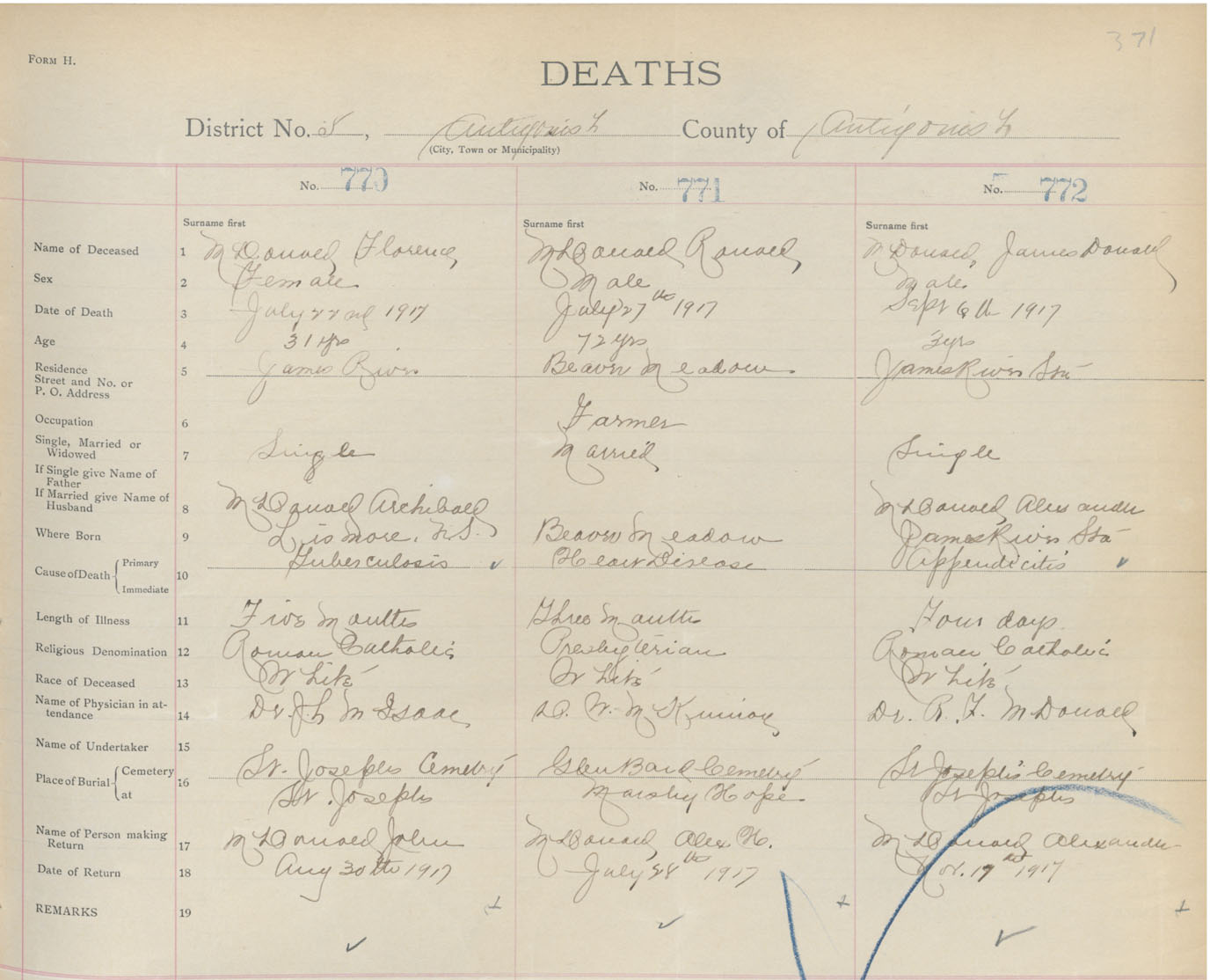 Male Death Registration: Year: 1917 book: 26 page: 371 number: 772
