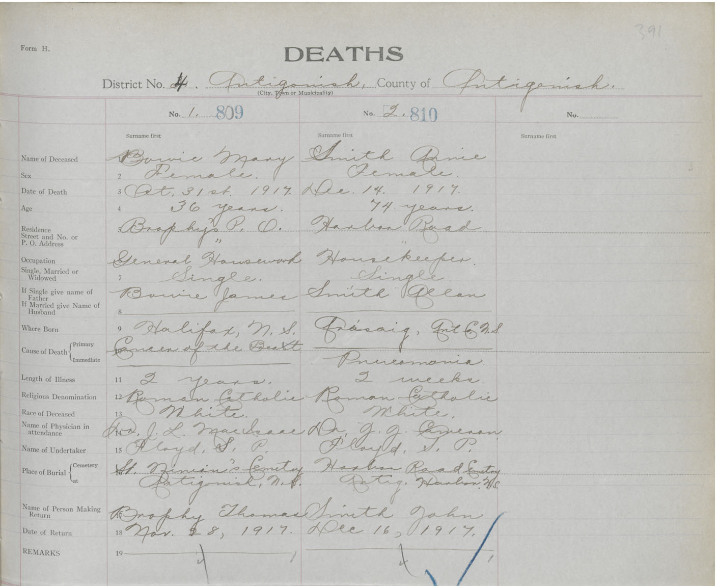 Female Death Registration: Year: 1917 book: 26 page: 391 number: 810
