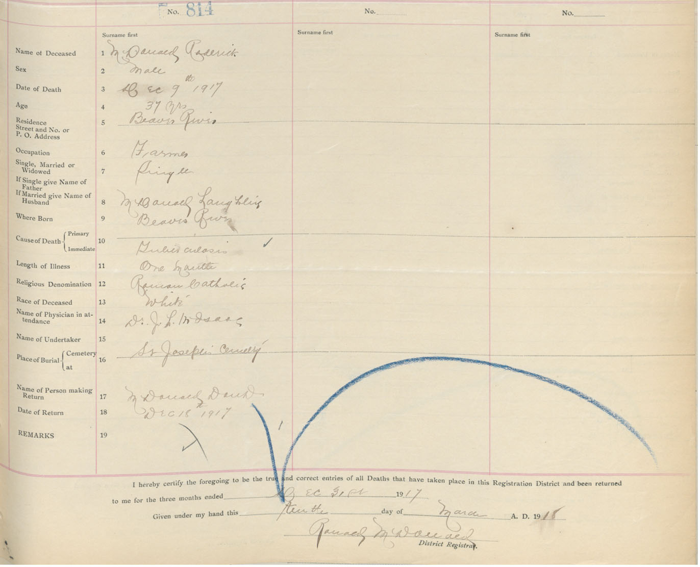 Male Death Registration: Year: 1917 book: 26 page: 393 number: 814