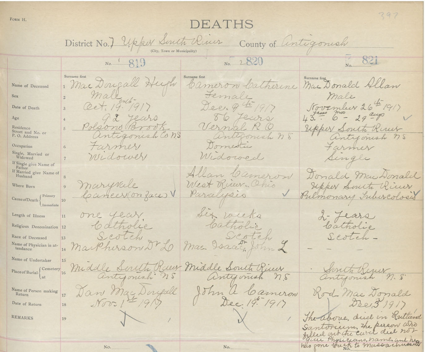 Male Death Registration: Year: 1917 book: 26 page: 397 number: 821