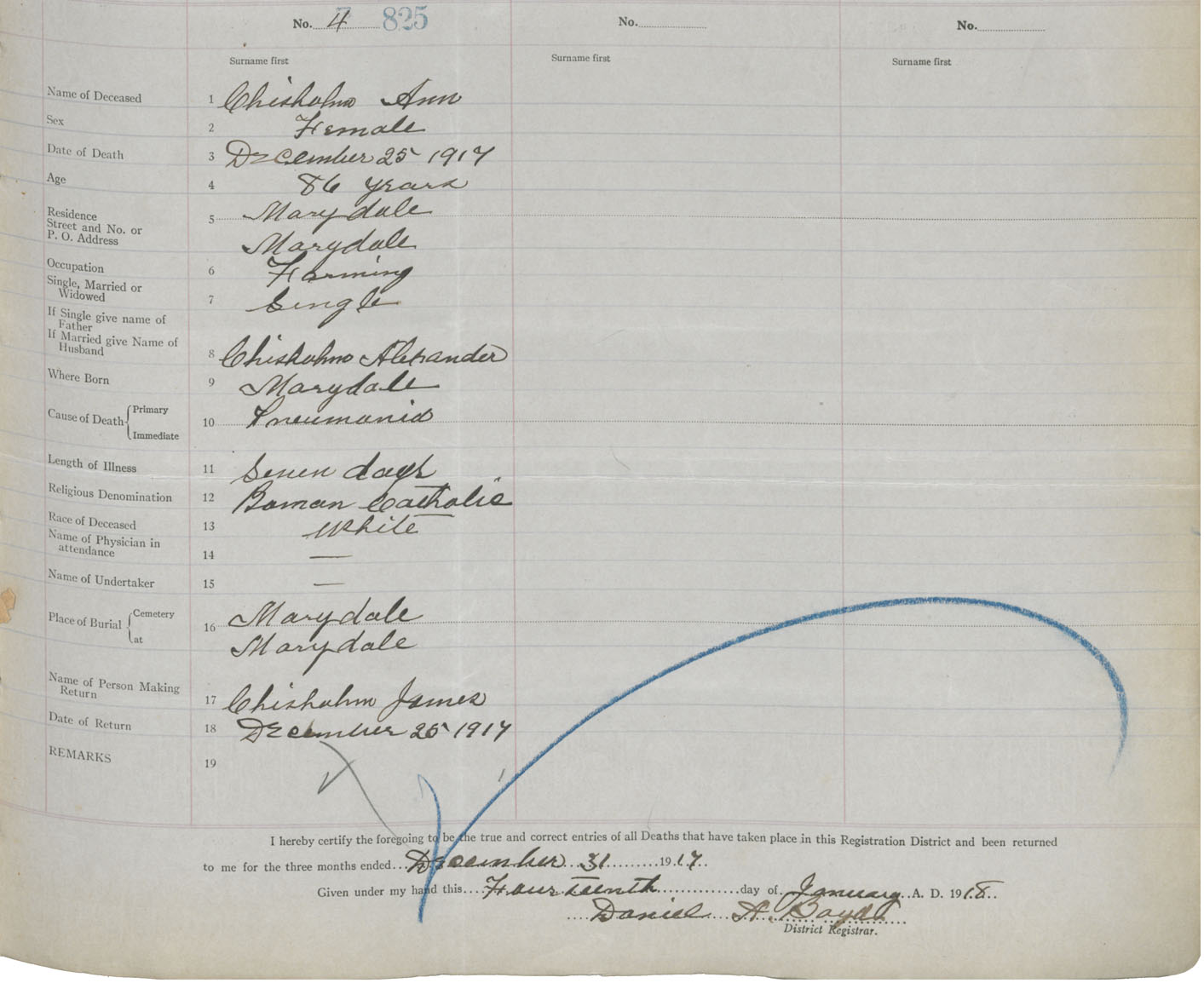 Female Death Registration: Year: 1917 book: 26 page: 399 number: 825