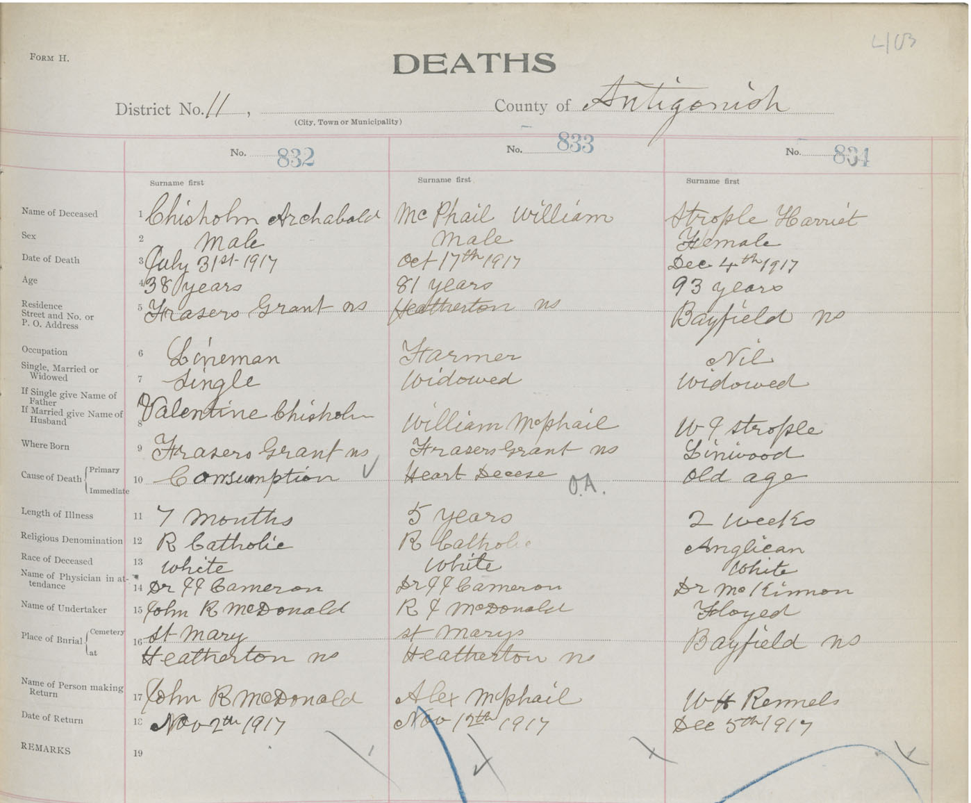 Female Death Registration: Year: 1917 book: 26 page: 403 number: 834
