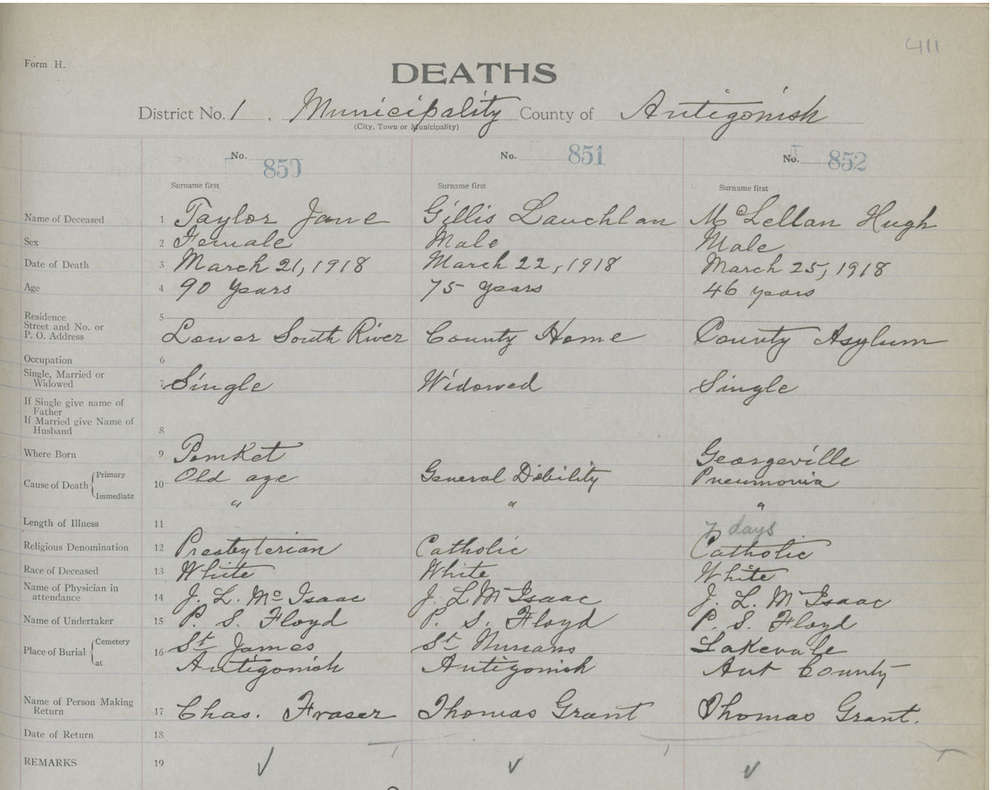 Male Death Registration: Year: 1918 book: 26 page: 411 number: 852