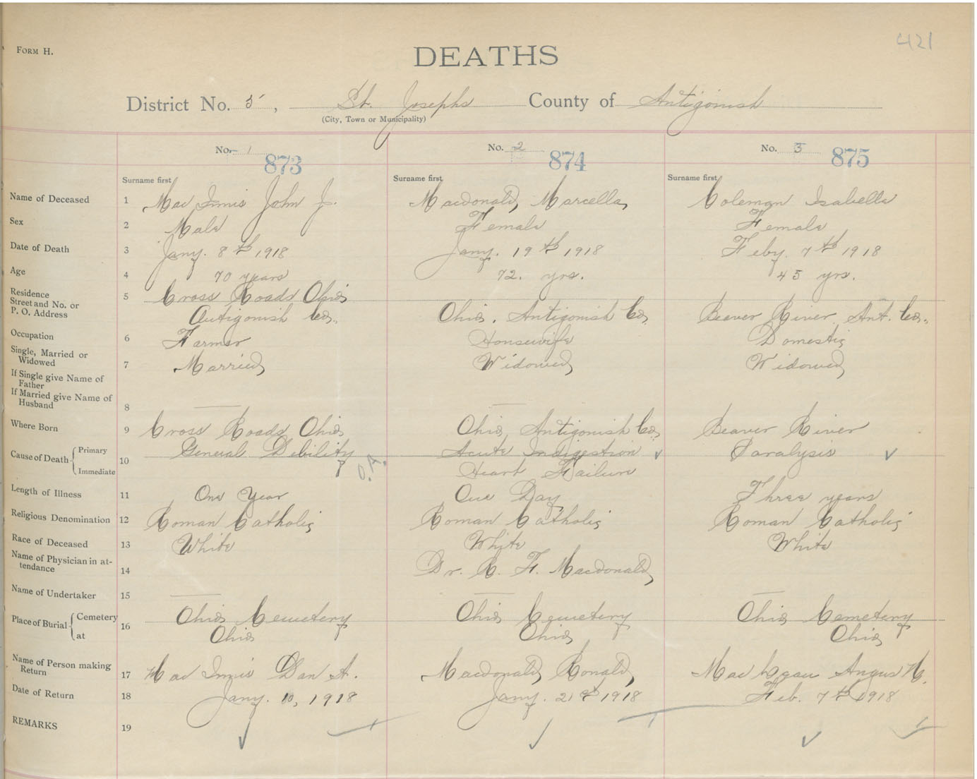 Female Death Registration: Year: 1918 book: 26 page: 421 number: 875