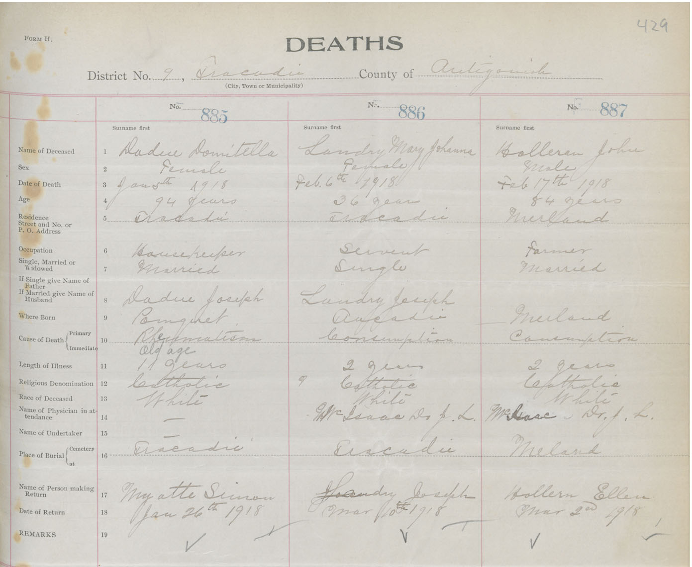 Male Death Registration: Year: 1918 book: 26 page: 429 number: 887