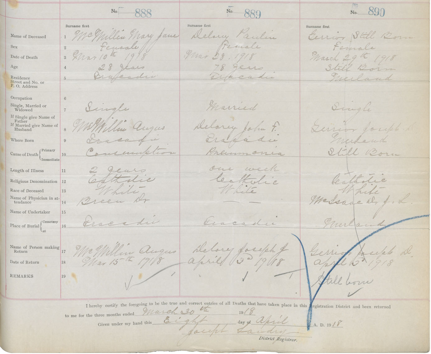 Female Death Registration: Year: 1918 book: 26 page: 429 number: 890