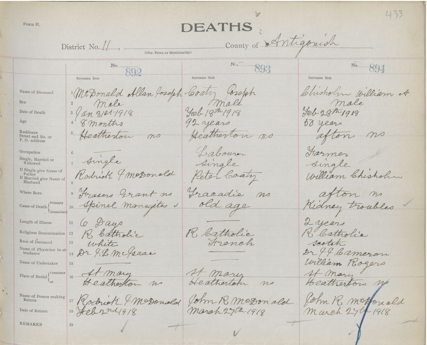 Male Death Registration: Year: 1918 book: 26 page: 433 number: 894