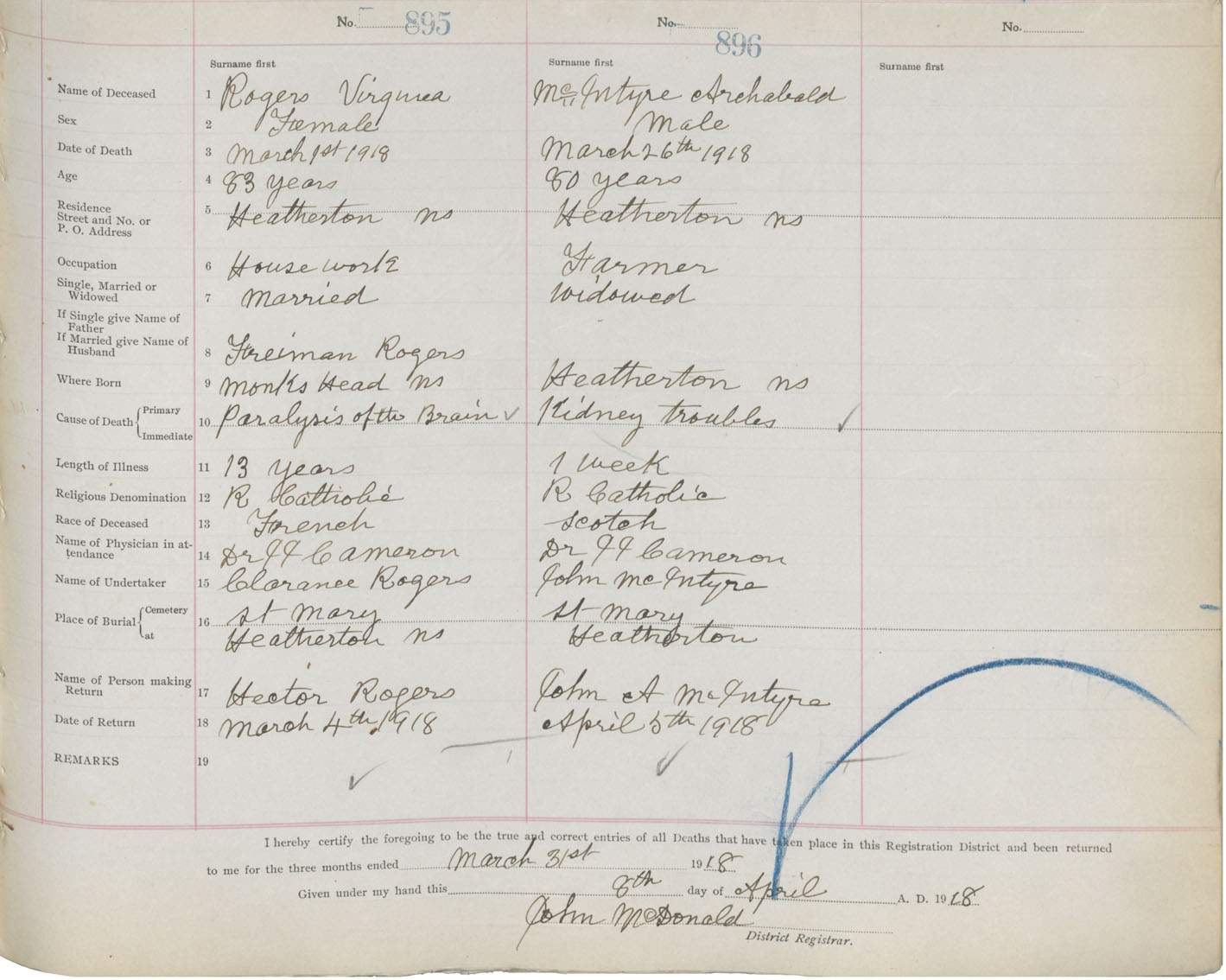 Male Death Registration: Year: 1918 book: 26 page: 433 number: 896