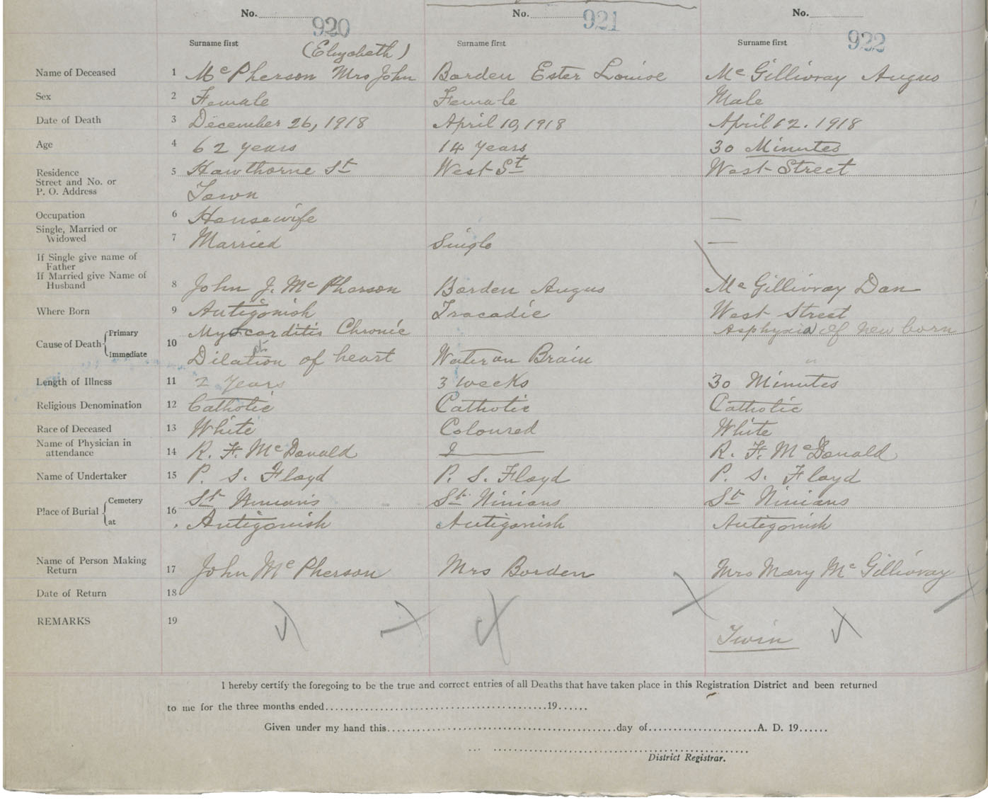 Female Death Registration: Year: 1918 book: 26 page: 442 number: 920