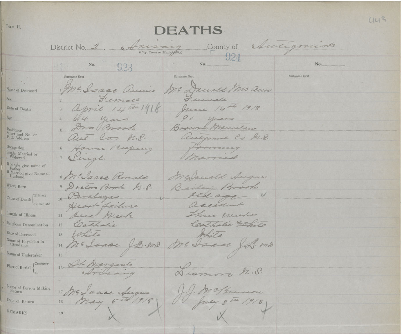 Female Death Registration: Year: 1918 book: 26 page: 443 number: 923