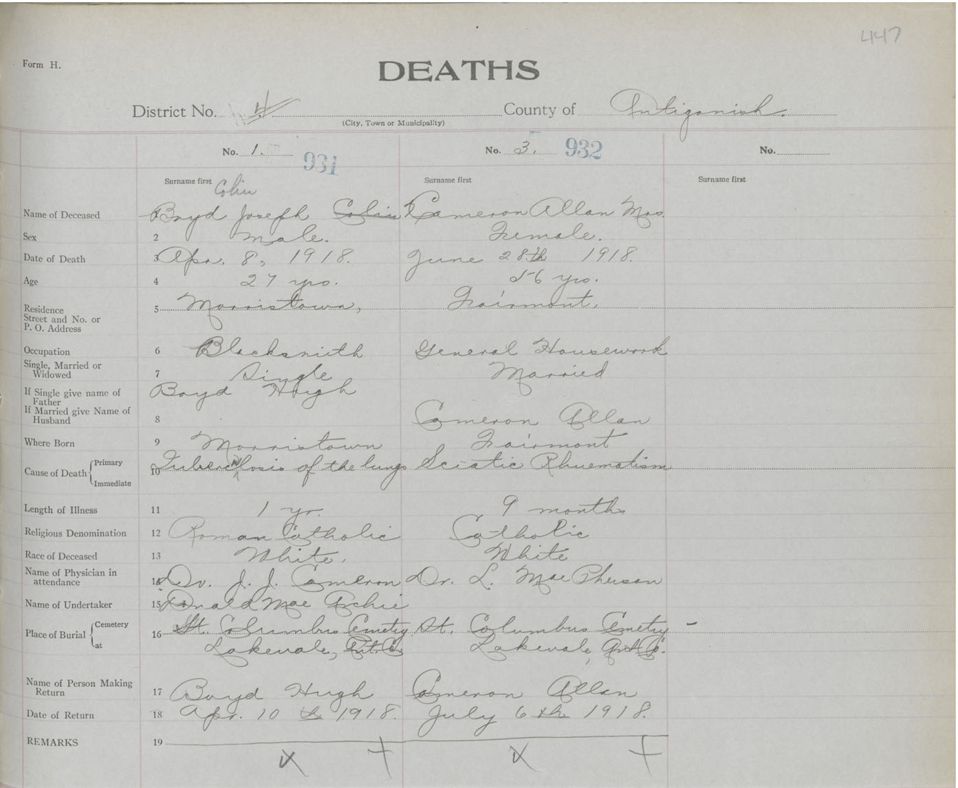 Female Death Registration: Year: 1918 book: 26 page: 447 number: 932