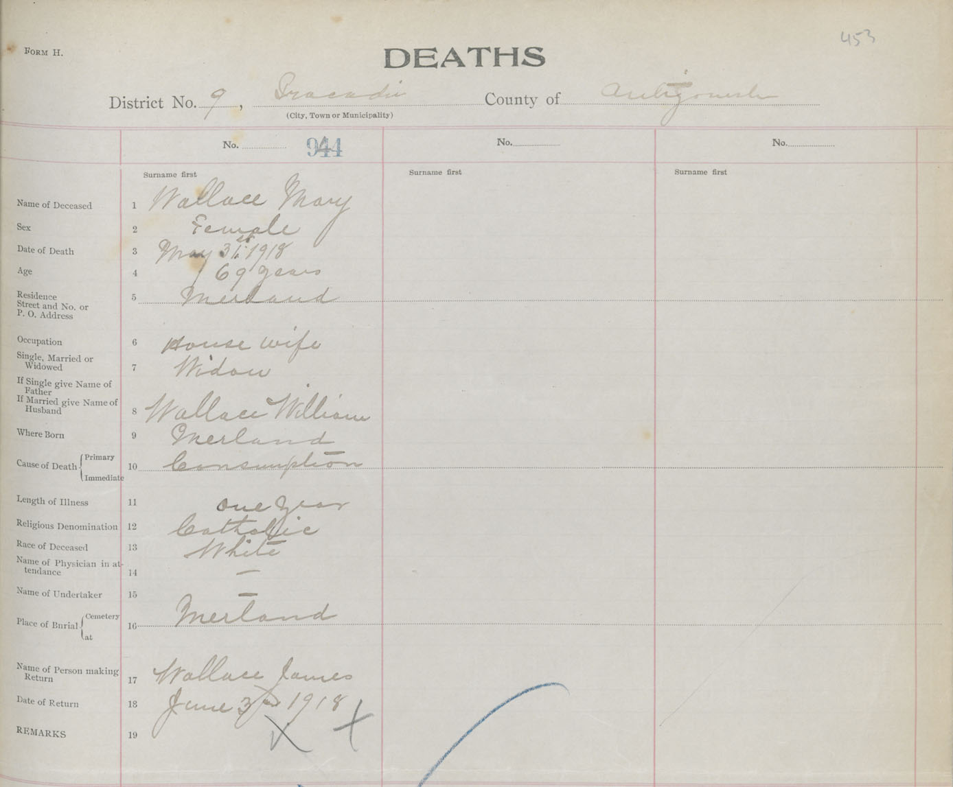 Female Death Registration: Year: 1918 book: 26 page: 453 number: 944