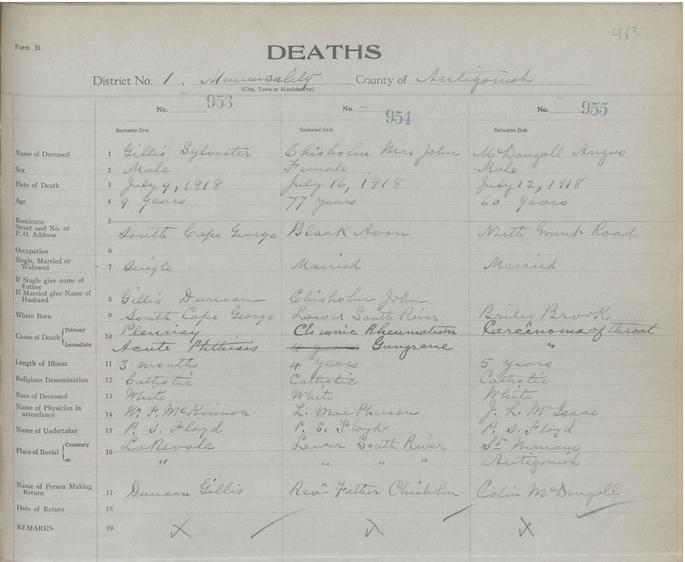 Male Death Registration: Year: 1918 book: 26 page: 463 number: 953