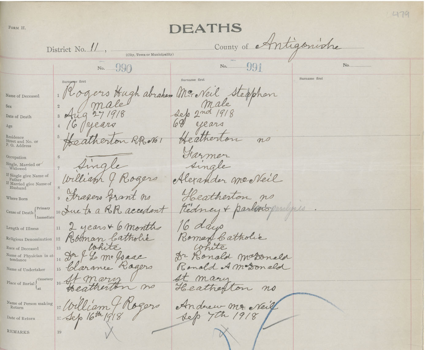 Male Death Registration: Year: 1918 book: 26 page: 479 number: 990