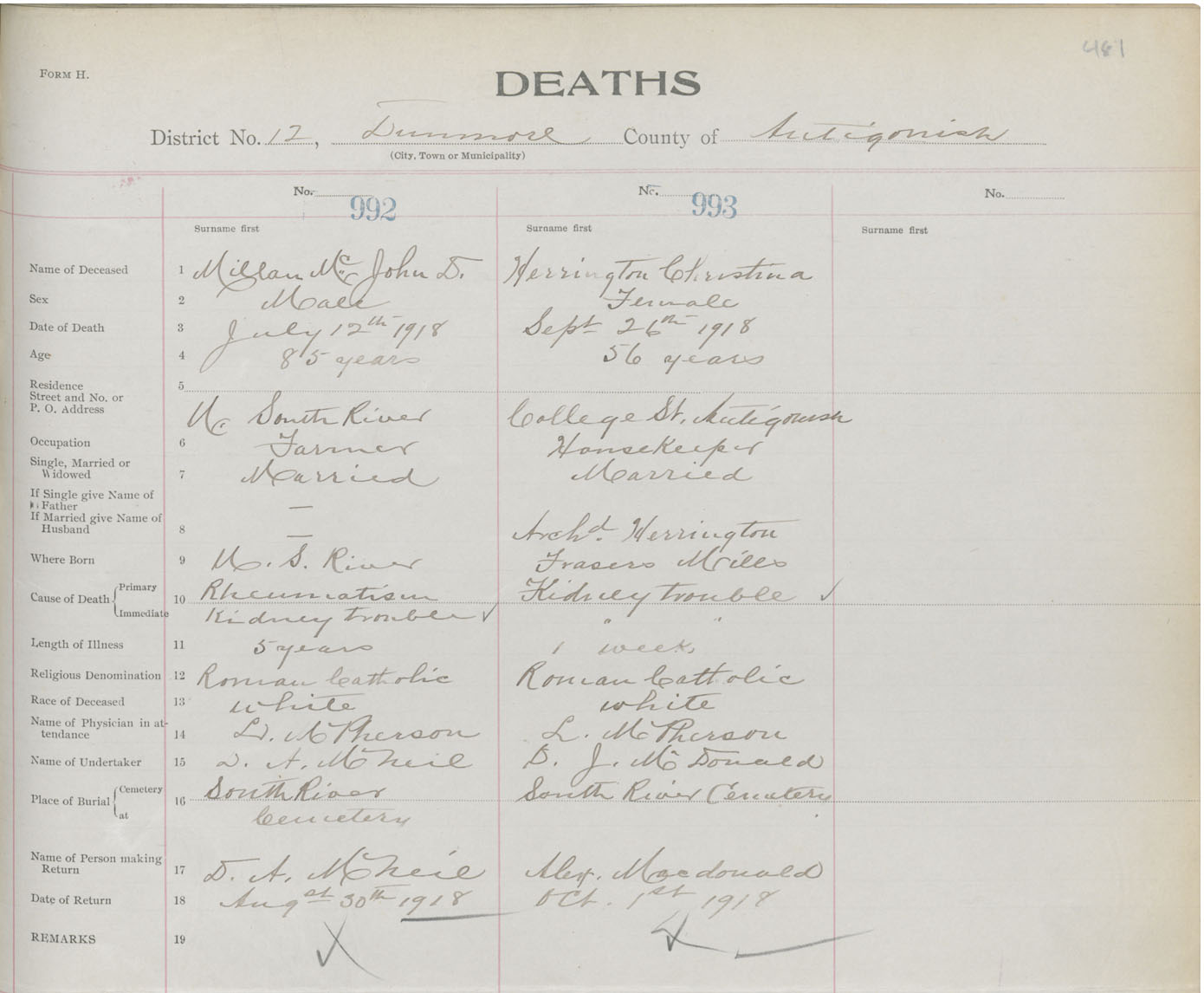 Male Death Registration: Year: 1918 book: 26 page: 481 number: 992