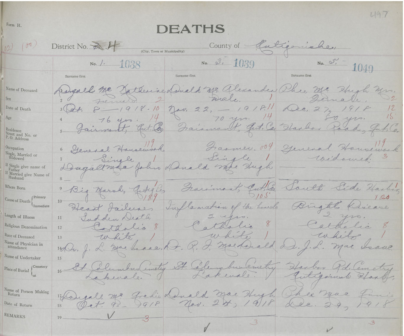 Female Death Registration: Year: 1918 book: 26 page: 497 number: 1038