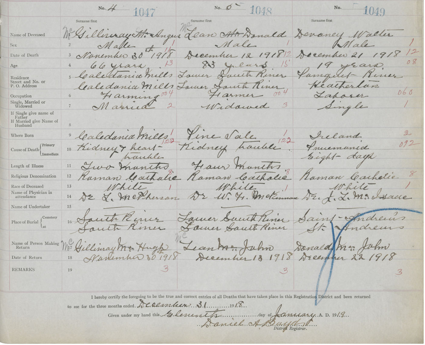Male Death Registration: Year: 1919 book: 26 page: 501 number: 1047