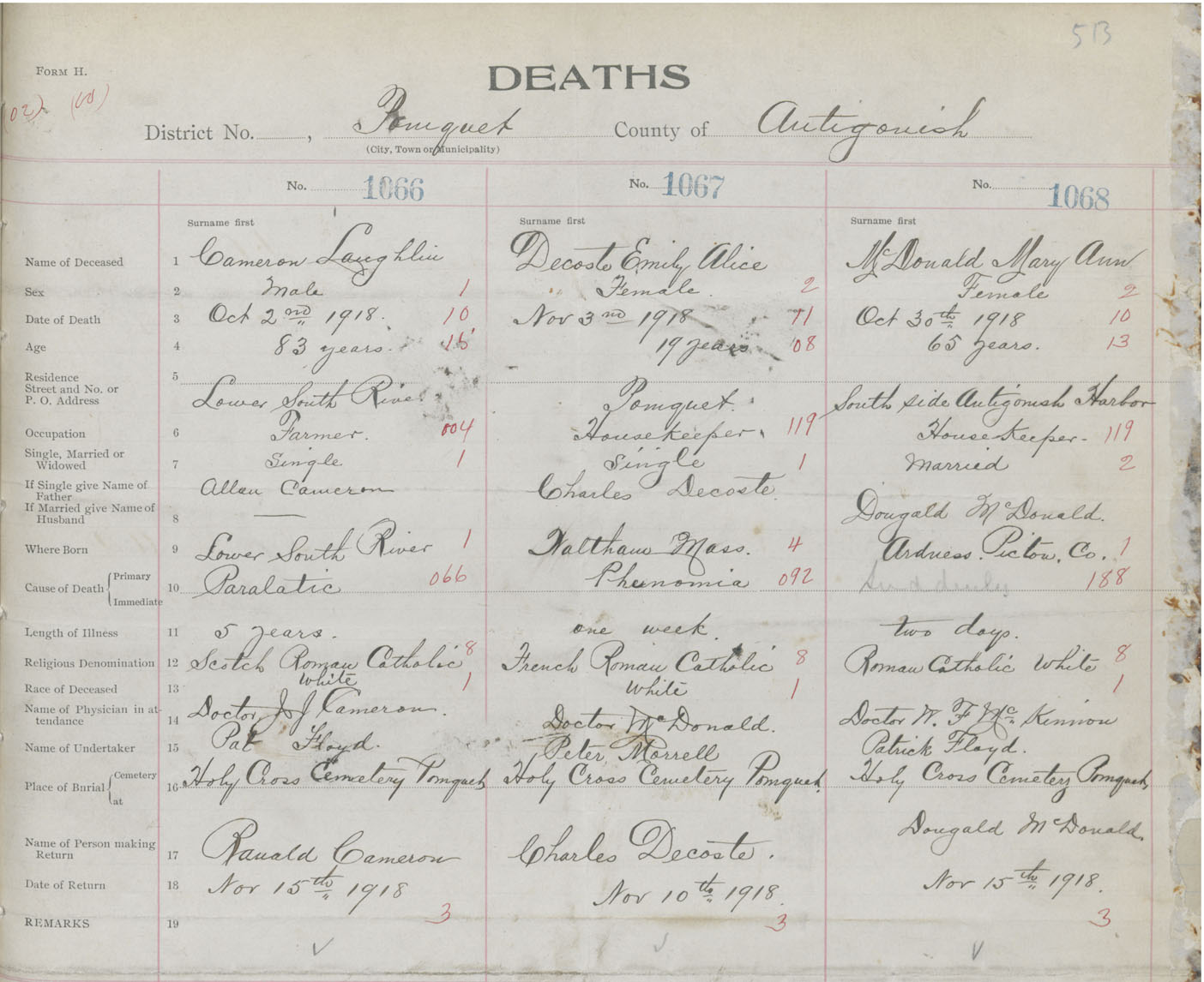 Male Death Registration: Year: 1918 book: 26 page: 513 number: 1066