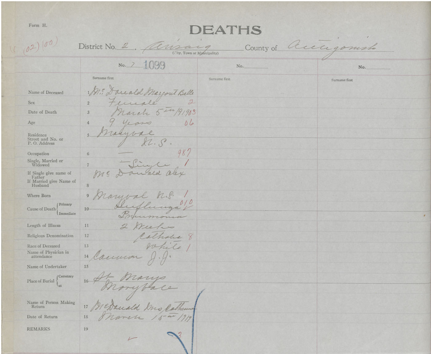 Female Death Registration: Year: 1919 book: 26 page: 520 number: 1099