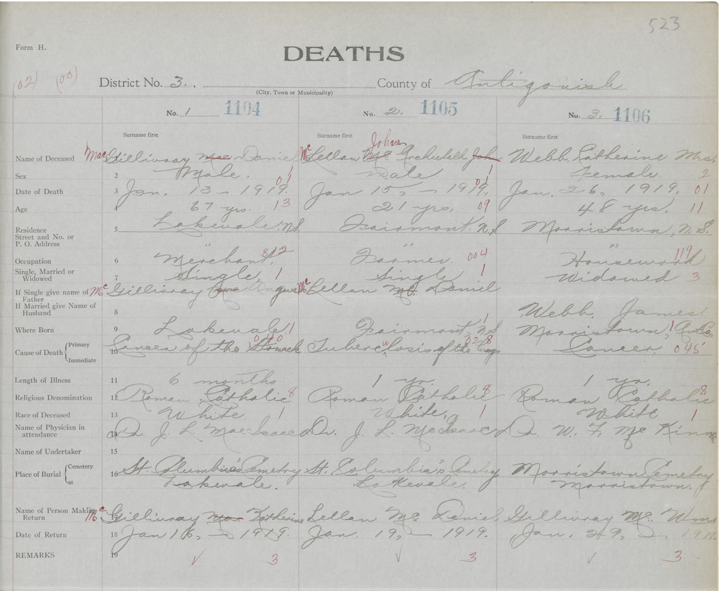 Male Death Registration: Year: 1919 book: 26 page: 523 number: 1104