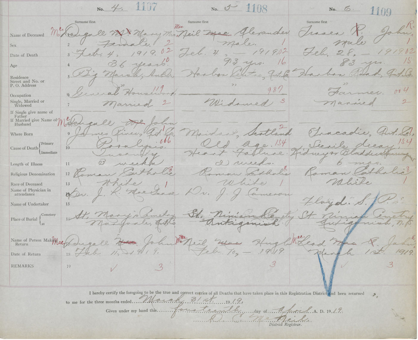 Female Death Registration: Year: 1919 book: 26 page: 523 number: 1107