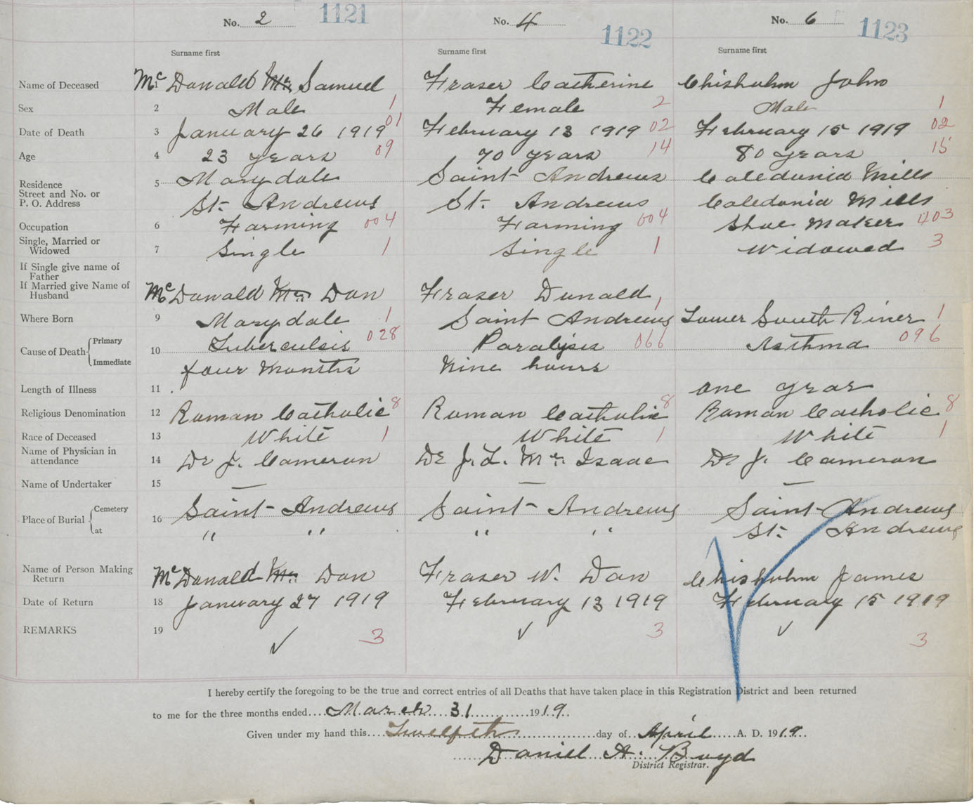 Male Death Registration: Year: 1919 book: 26 page: 533 number: 1121