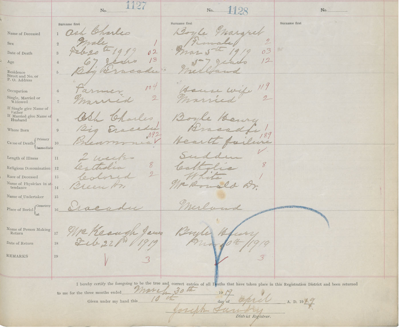 Male Death Registration: Year: 1919 book: 26 page: 535 number: 1127
