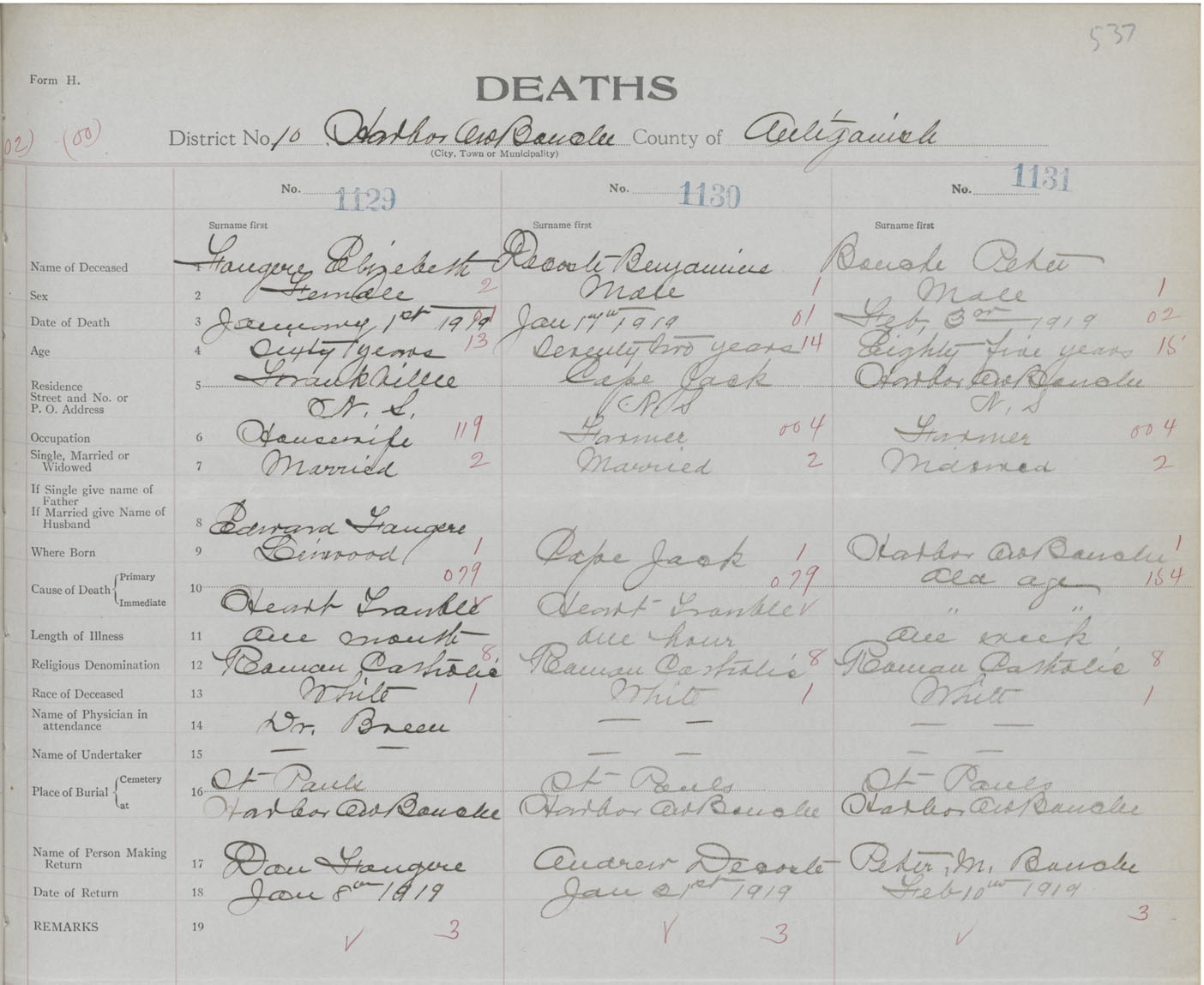 Female Death Registration: Year: 1919 book: 26 page: 537 number: 1129