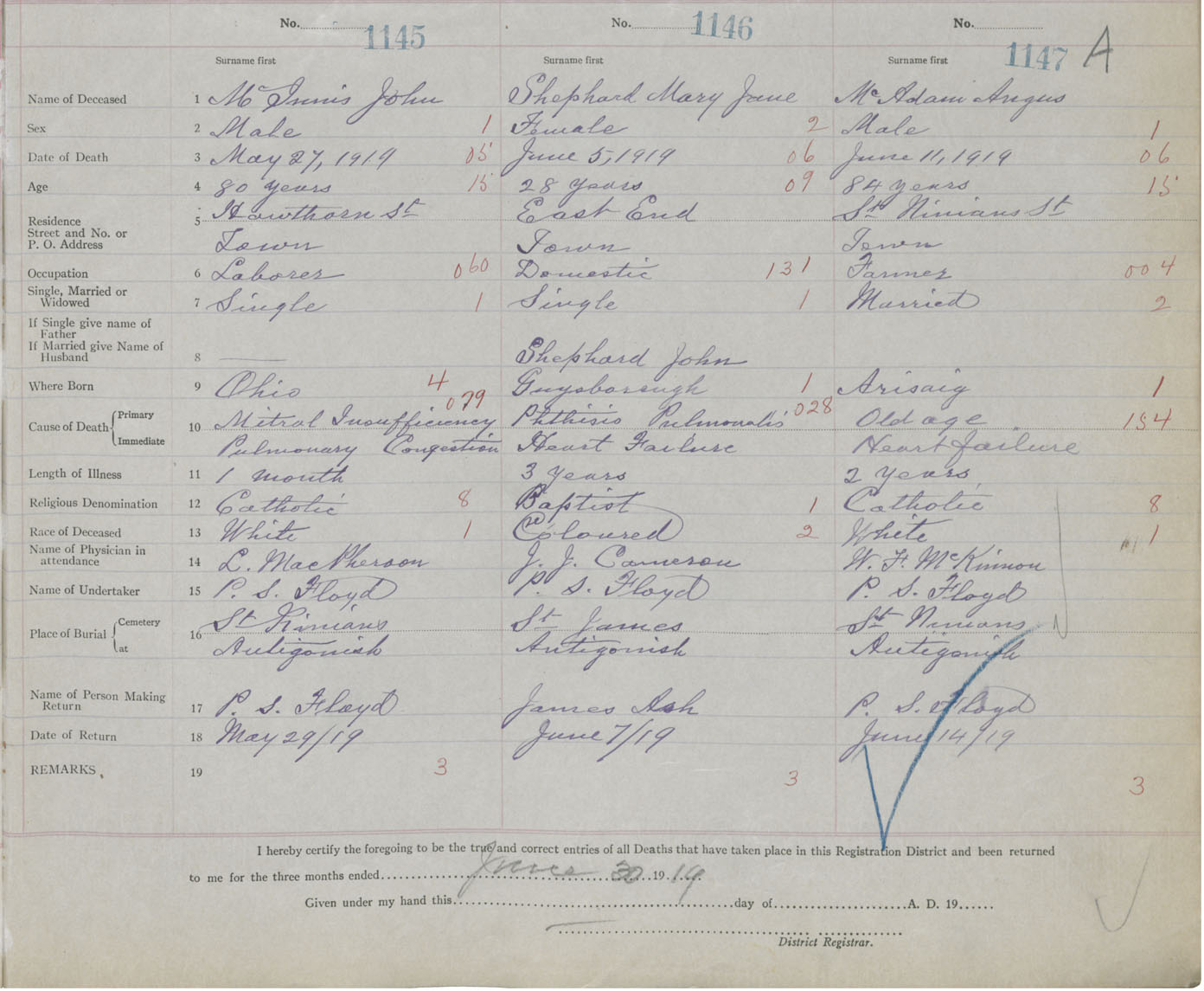 Male Death Registration: Year: 1919 book: 26 page: 545 number: 1145