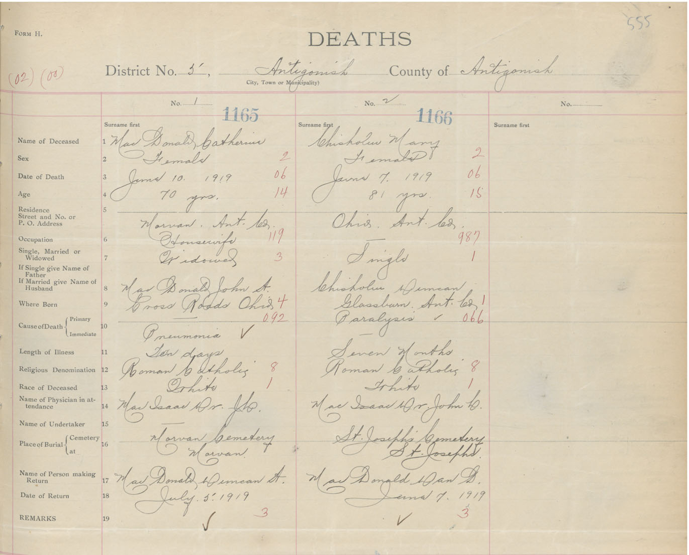 Female Death Registration: Year: 1919 book: 26 page: 555 number: 1165