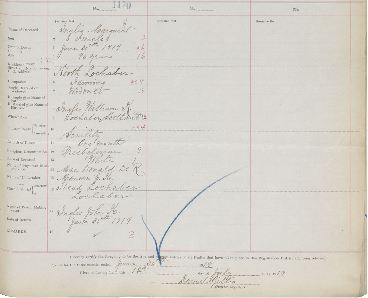 Female Death Registration: Year: 1919 book: 26 page: 557 number: 1170