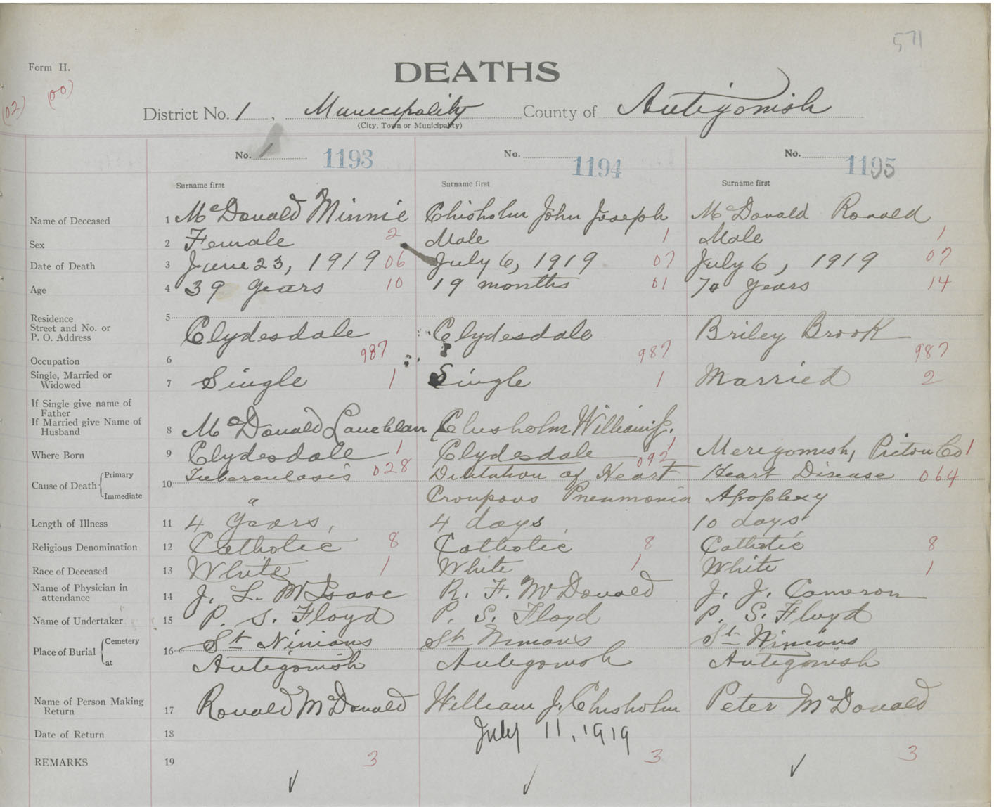 Female Death Registration: Year: 1919 book: 26 page: 571 number: 1193