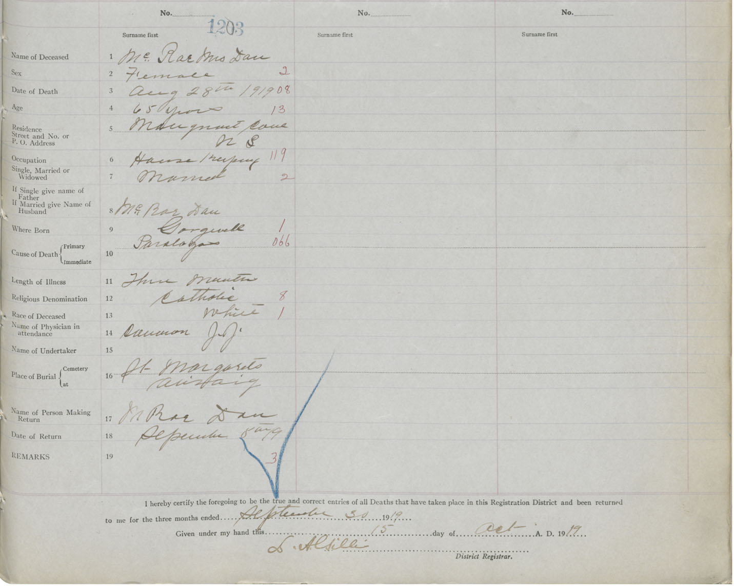 Female Death Registration: Year: 1919 book: 26 page: 573 number: 1203