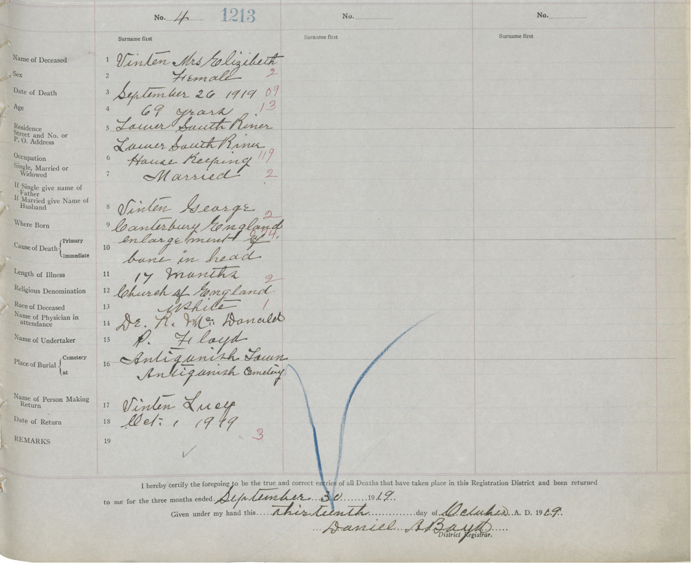 Female Death Registration: Year: 1919 book: 26 page: 583 number: 1213