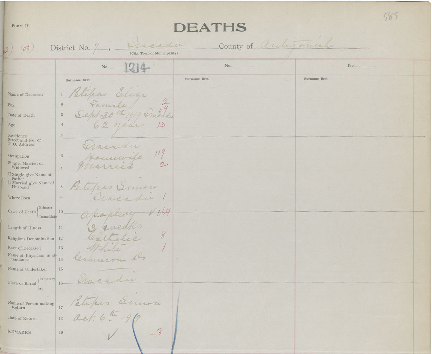 Female Death Registration: Year: 1919 book: 26 page: 585 number: 1214