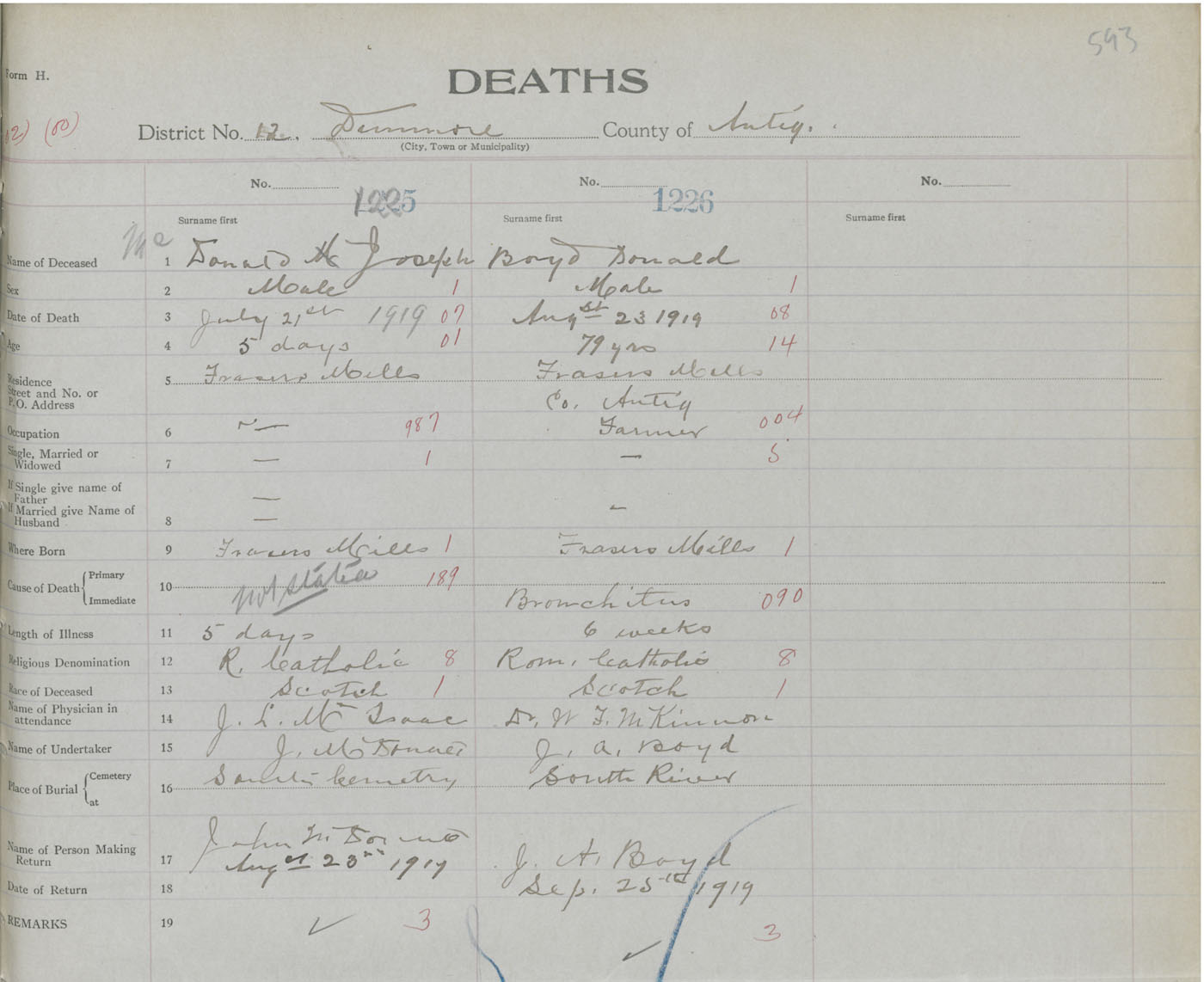 Male Death Registration: Year: 1919 book: 26 page: 593 number: 1225