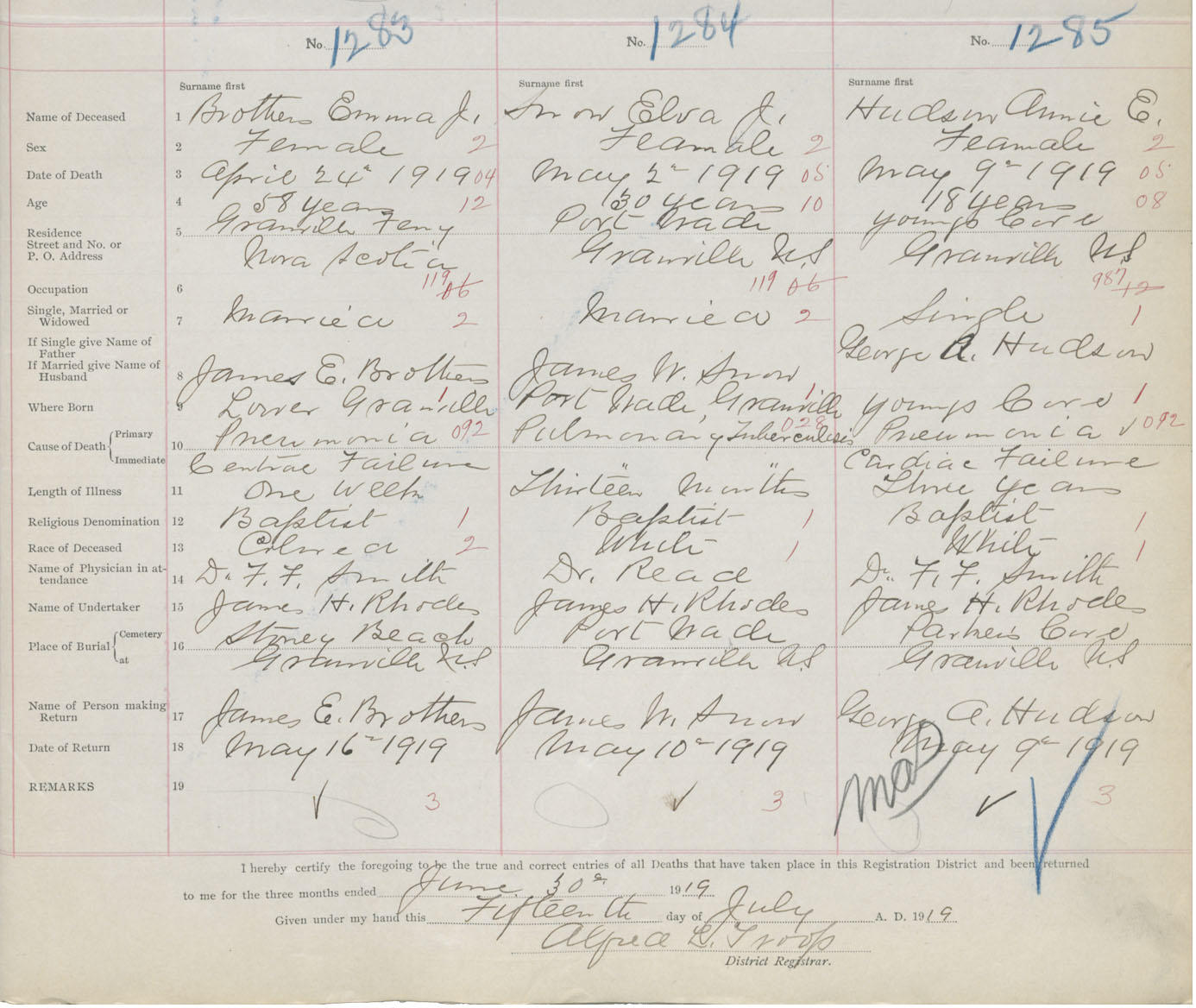 Death Registration: Year: 1919 book: 27 page: 471 number: 1285