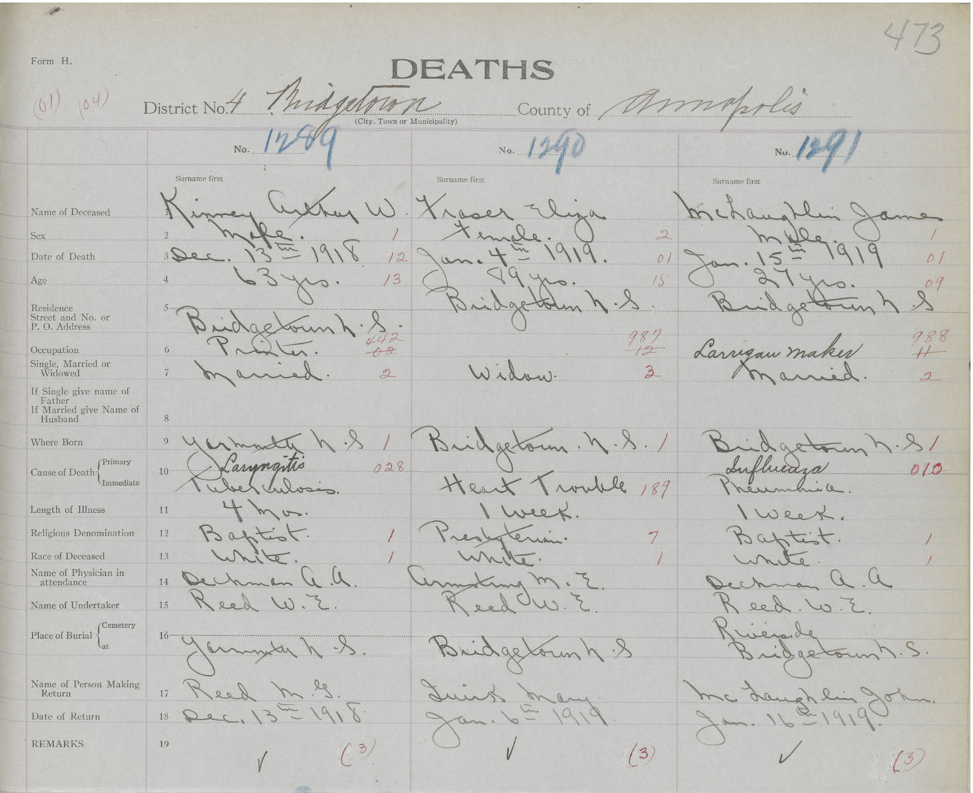 Death Registration: Year: 1919 book: 27 page: 473 number: 1291