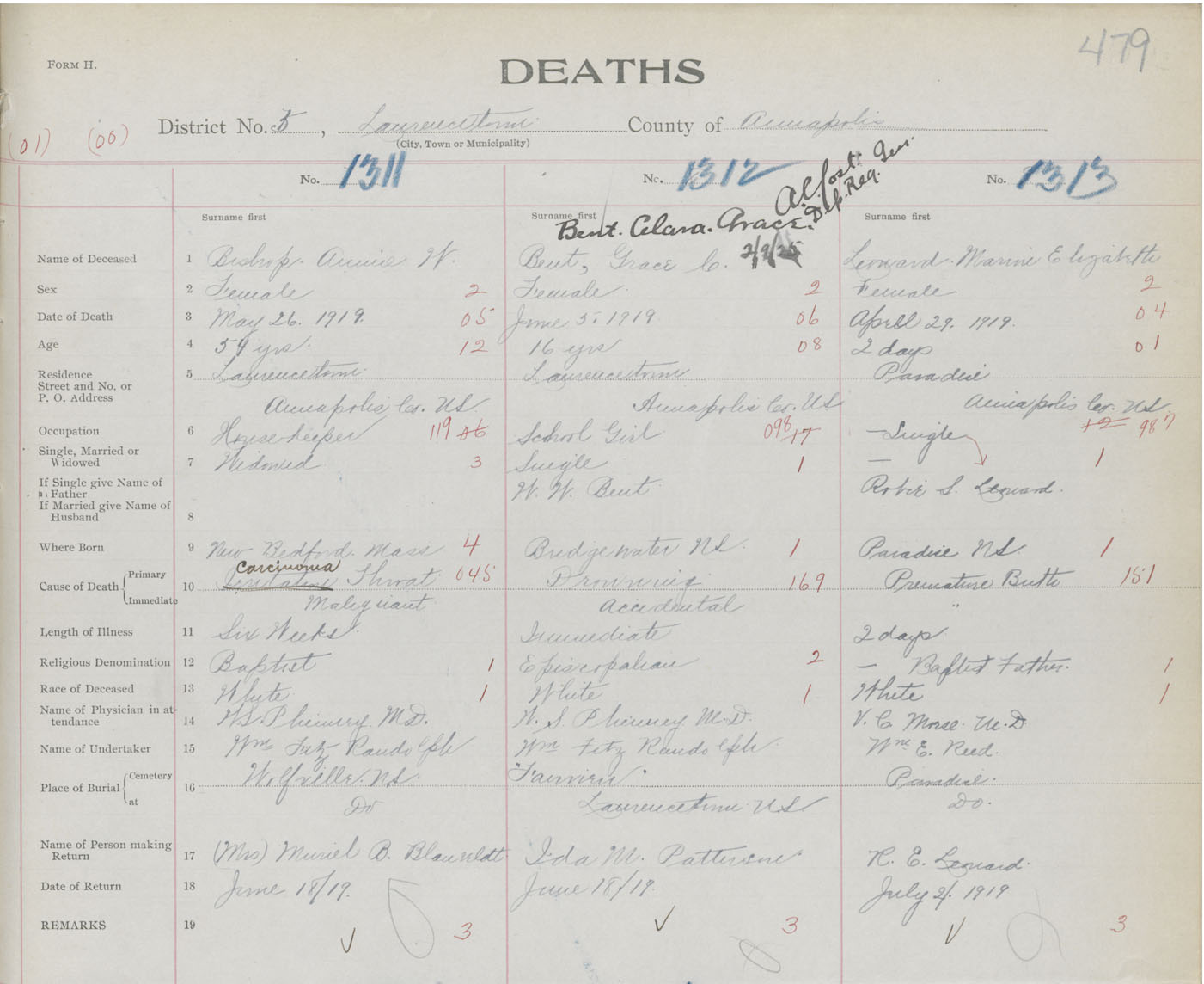 Death Registration: Year: 1919 book: 27 page: 479 number: 1313
