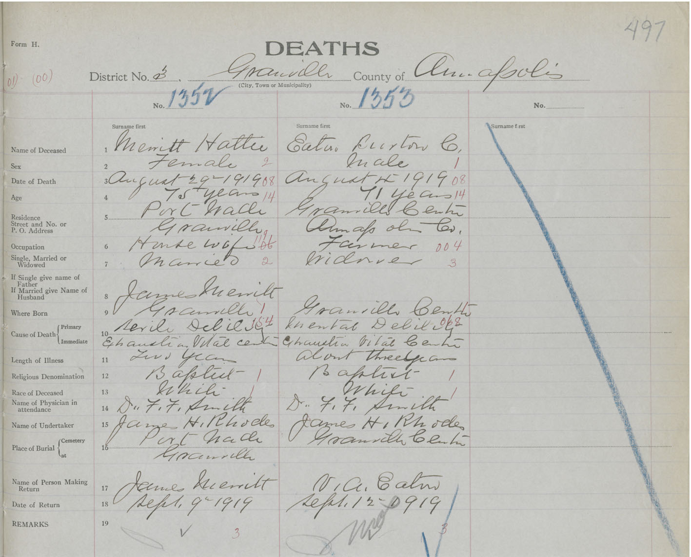 Death Registration: Year: 1919 book: 27 page: 497 number: 1353