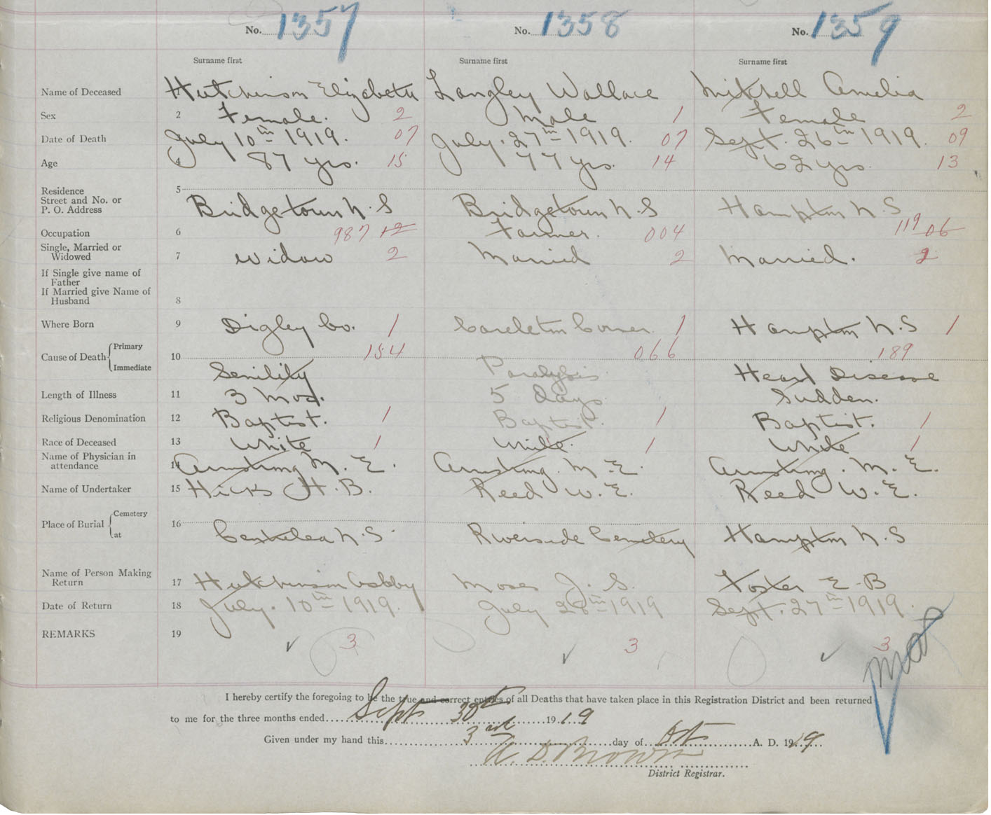 Death Registration: Year: 1919 book: 27 page: 499 number: 1359