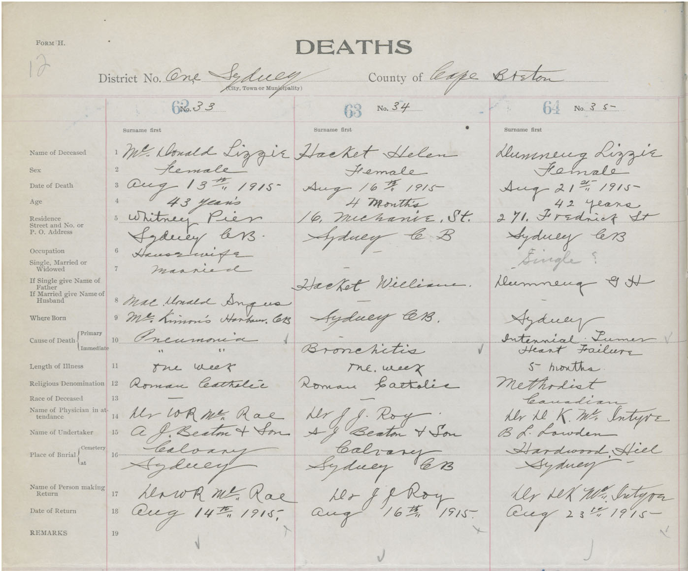 Female Death Registration: Year: 1915 book: 28 page: 12 number: 64