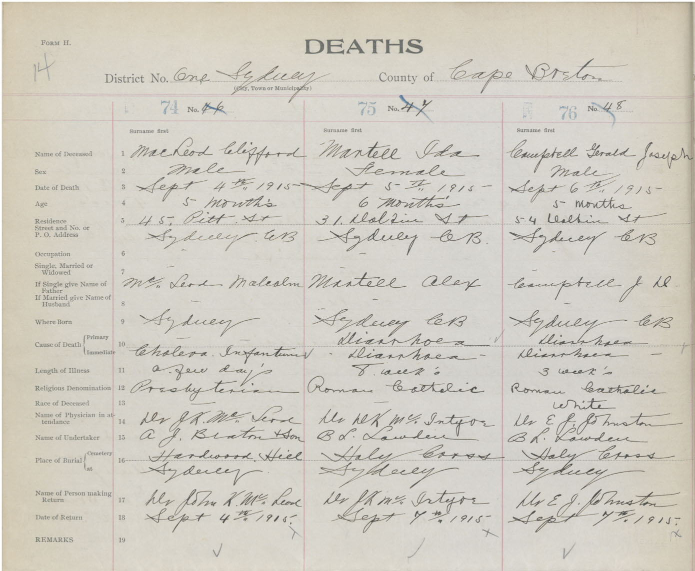 Male Death Registration: Year: 1915 book: 28 page: 14 number: 74
