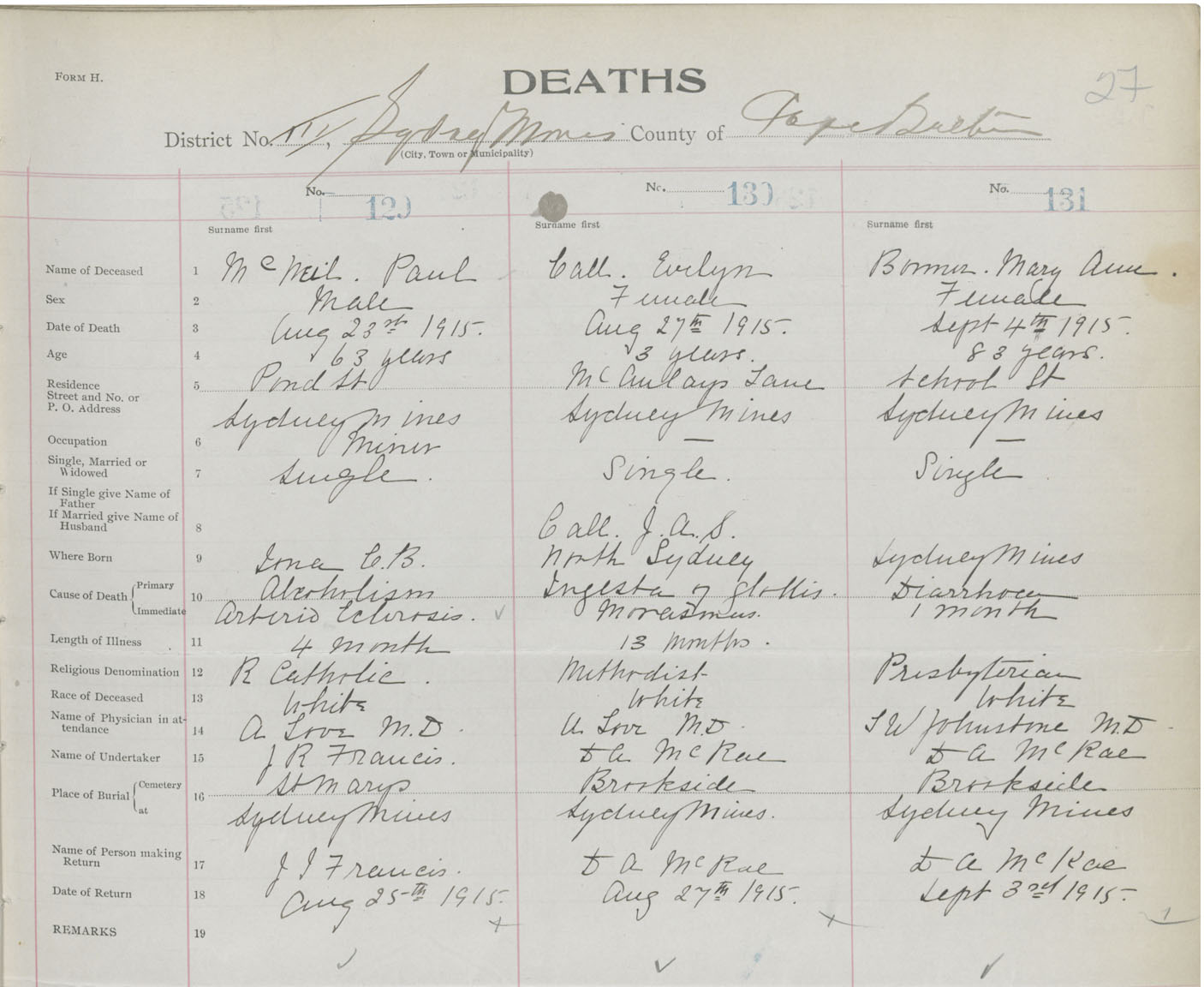 Male Death Registration: Year: 1915 book: 28 page: 27 number: 129