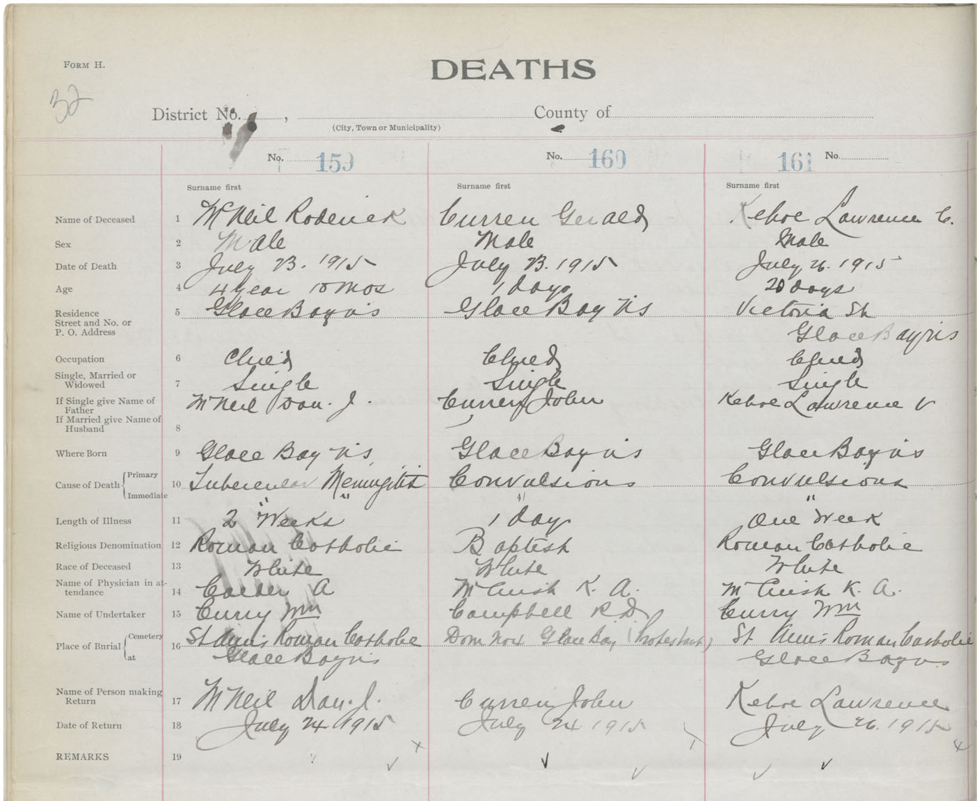 Male Death Registration: Year: 1915 book: 28 page: 32 number: 161